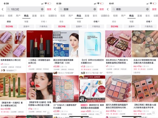 但隨著各大新電商平臺(tái)的出現(xiàn)和入場,低價(jià)產(chǎn)品瞄準(zhǔn)了這些新的渠道。在這里,消費(fèi)者可以用9.9元搶到爆款口紅、用到不到1元錢一片的面膜。目前,在抖音、快手、拼多多各大平臺(tái)和直播間的低價(jià)商品,涉及面膜、彩妝、護(hù)膚、精華、洗護(hù)等多種品類。