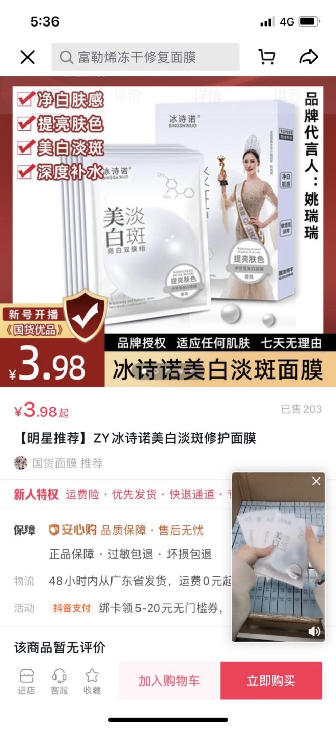 在抖音直播間,不乏這種超低價(jià)的明星美妝單品。青眼注意到,在一家名為國貨面膜直播間,售賣的一款3.98元一盒(5片)ZY冰詩諾美白淡斑修護(hù)面膜,該產(chǎn)品宣稱具有美白、淡化色斑等功效并取得了特殊用途化妝品行政許可證,批準(zhǔn)文號(hào)為國妝特字號(hào)G20150845,生產(chǎn)企業(yè)為佛山市南海區(qū)里水從容化妝品廠。但青眼查詢國產(chǎn)特殊化妝品注冊信息發(fā)現(xiàn),該批準(zhǔn)文號(hào)對(duì)應(yīng)的產(chǎn)品名稱是伊思雪美白面膜。根據(jù)我國特殊用途化妝品“一品一證”的規(guī)定,這種行為涉嫌違規(guī)。