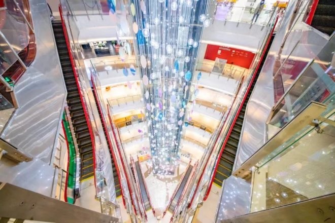 這已經(jīng)是國大第三年沒有參與各大購物中心的圣誕樹內(nèi)卷戰(zhàn)爭了。兩年前,國大率先打破傳統(tǒng)意義上的圣誕樹,一夜之間在門前長出七棵巨大的“樹”;去年,在三樓混天綾處造了一個溫暖樹屋,屋內(nèi)七棵“樹”的意象生長。
