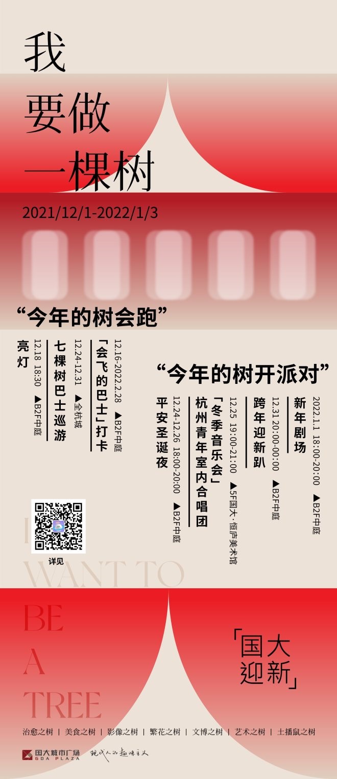 顧客精神意象成樹,點亮杭州生活之光。今年,國大依然不忘初心,種下七棵由精神凝聚而成的樹——治愈之樹、美食之樹、影像之樹、繁花之樹、文博之樹、藝術(shù)之樹、土播鼠之樹。屆時這七棵樹還將化身為移動巴士,環(huán)城巡游,從舊年駛向新年。每一棵樹都是對2021年國大一整年主要活動和主張的融合,也滿含對2022年的期盼。