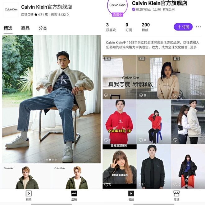在商家側(cè),現(xiàn)階段抖音盒子邀請(qǐng)入駐的商家以品牌旗艦店鋪為主。從推薦商品流處點(diǎn)進(jìn)店鋪,共呈現(xiàn)了視頻和店鋪兩個(gè)入口,其中店鋪?lái)敳抗灿芯x、商品和分類三個(gè)標(biāo)簽,分別用來(lái)展示品牌、貨品和分類篩選,頁(yè)面類似天貓旗艦店。視頻頁(yè)面則是抖音同步過(guò)來(lái)的短視頻展示合集。
