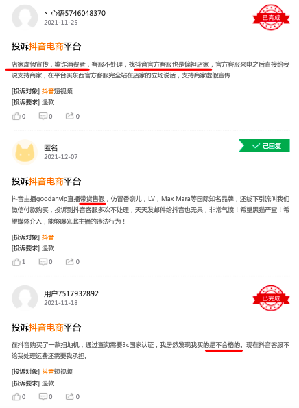 另一方面,產(chǎn)品質(zhì)量問(wèn)題頻遭質(zhì)疑。《2021年9月中國(guó)電子商務(wù)用戶(hù)體驗(yàn)與投訴監(jiān)測(cè)報(bào)告》中,抖音投訴量排在前十,而千萬(wàn)大博主直播間購(gòu)買(mǎi)到假面膜、喬奇阿瑪尼等投訴也讓抖音電商的口碑堪憂(yōu)。