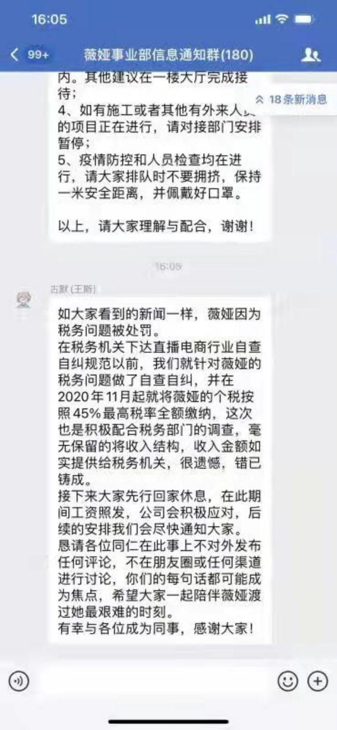 事發(fā)不久,一張“薇婭事業(yè)部信息通知群”的群聊截圖在網(wǎng)絡(luò)上流傳,名為“古默 (王斯) ”的員工于16:05分發(fā)出消息:接下來大家先行回家休息,在此期間工資照發(fā),公司會積極應(yīng)對。據(jù)了解,薇婭經(jīng)紀(jì)人就叫王斯,花名古默。
