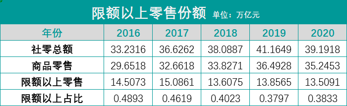近年來(lái),我國(guó)限額以上貿(mào)易企業(yè)的商品零售在社會(huì)消費(fèi)品零售總額的占比加速下降,從2016年的48.93%下降到2020年的38.33%,年均下降2.9個(gè)百分點(diǎn),如表1所示。限額以上零售企業(yè)是指年銷售額在500萬(wàn)元及以上的企業(yè)。與2016年之前每年平均下降一個(gè)百分點(diǎn)相比,下降速度在加劇。我國(guó)零售業(yè)出現(xiàn)了極其奇怪的現(xiàn)象:好的做不大,大的做不好。