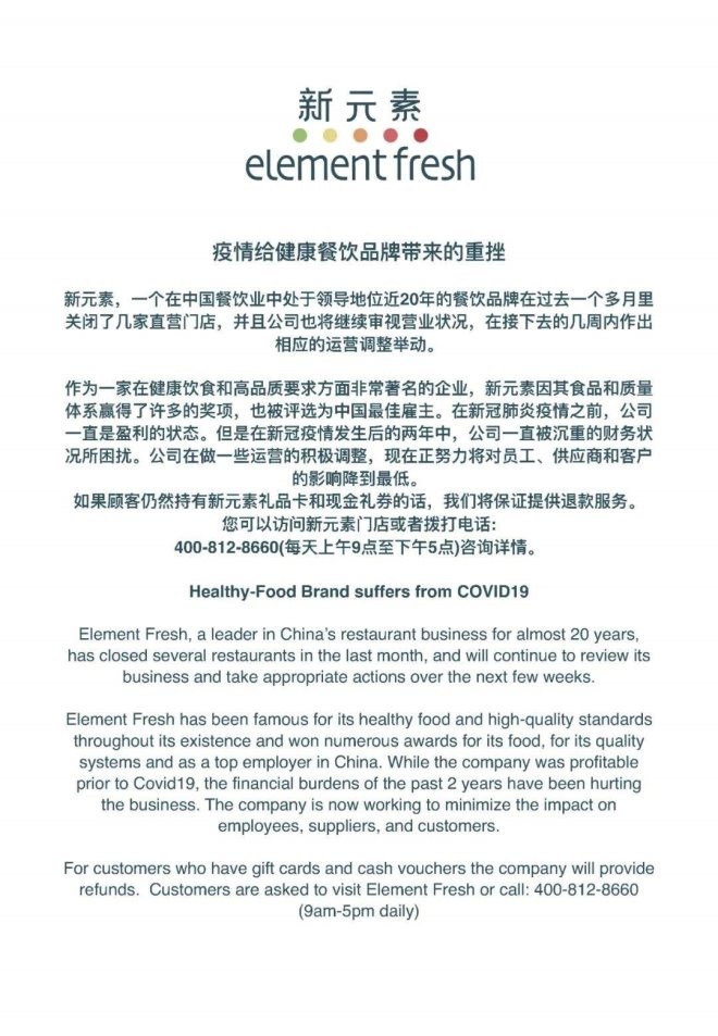 12月20日,新元素官方發(fā)文稱:過去一個(gè)月已關(guān)閉幾家門店,將在將在未來幾周作出相應(yīng)的運(yùn)營調(diào)整舉動(dòng),并向持有禮品卡或現(xiàn)金禮券的顧客提供退款服務(wù)。