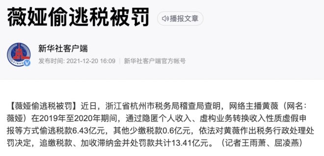 12月20日下午,從「薇婭因偷逃稅被罰13.41億」的新聞爆出以來,這兩天關(guān)于薇婭個(gè)人,關(guān)于電商平臺和主播,關(guān)于直播帶貨行業(yè)等的內(nèi)容已經(jīng)鋪天蓋地。