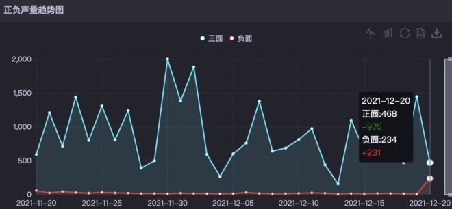 2、近一個(gè)月以來,#薇婭#的相關(guān)話題大多為正面內(nèi)容主導(dǎo),負(fù)面聲量集中在12月20日被罰13.41億新聞爆出后,負(fù)面內(nèi)容陡增的同時(shí),正面內(nèi)容大幅減少。