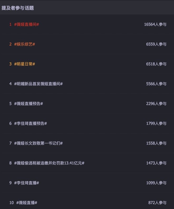 5、另外,通過近一個(gè)月內(nèi)#薇婭#提及者參與的社交話題,也可以看出,網(wǎng)友對于薇婭的關(guān)注和討論,主要集中在「直播」和社會(huì)新聞。