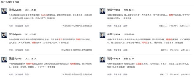 可以說,大主播的崛起離不開品牌加持。比如,12月20日,薇婭被罰13.41億新聞爆出;12月21日,曾經(jīng)出現(xiàn)在「薇婭直播間」的品牌「玉澤」,就登上了熱搜,也表明了在消費(fèi)者心智中,很多品牌已經(jīng)和大主播產(chǎn)生了深度關(guān)聯(lián)。那么,我們一起看看,有哪些品牌過去和「薇婭直播間」合作密切?