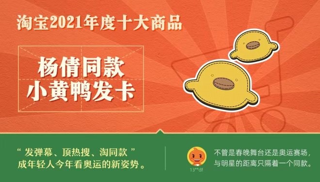 12月22日,淘寶發(fā)布2021年度十大商品,頻上熱搜的奧運(yùn)冠軍“楊倩同款小黃鴨發(fā)卡”、年初火到海外的“搪瓷痰盂”、熱播劇《覺(jué)醒年代》周邊、“露肩疫苗裝”等網(wǎng)紅話題商品高票入選。值得注意的是,“楊倩同款小黃鴨發(fā)卡”主要產(chǎn)自“世界小商品之都”義烏,在楊倩奪冠一小時(shí)后,義烏工廠以“1秒發(fā)6只奧運(yùn)冠軍同款”演繹奧運(yùn)經(jīng)濟(jì)的“中國(guó)速度”。