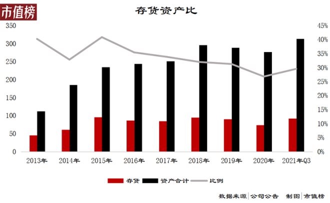舉個例子,2019年末,庫齡一年內(nèi)的存貨為59.77億元,到2020年末,1—2年庫齡的存貨余額為24.21億元(賬面價值+跌價準(zhǔn)備),也就是說生產(chǎn)于2019年的存貨在2020年銷售了35.56億元,占營業(yè)成本31.6%,如果算上2年以上庫齡的產(chǎn)品在2020年的銷售情況,比重至少40%。