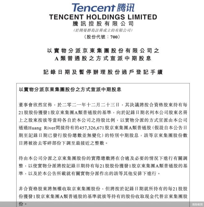 按照京東2021年12月22日在聯(lián)交所買賣的收市價每股279.2港元計算,騰訊分配的4.6億股總市值約為1277億港元。