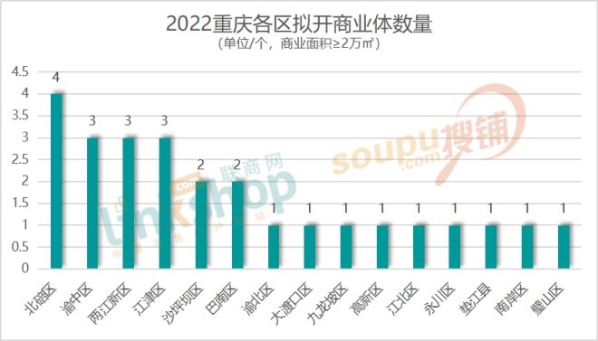 從數(shù)據(jù)統(tǒng)計(jì)來(lái)看,2022年將是重慶商業(yè)“大年”,憑一己之力可與四川全省明年的新增供應(yīng)量相匹敵。從商業(yè)體分布來(lái)看,重慶九大中心城區(qū)、兩江四岸核心區(qū)以及周邊區(qū)縣均有新增商業(yè)體入市,其中北碚區(qū)是供應(yīng)主力,明年將開(kāi)出4個(gè)新項(xiàng)目,其次是江津區(qū)、渝中區(qū)、兩江新區(qū),各有3個(gè)新項(xiàng)目問(wèn)世,沙坪壩、巴南也均有2個(gè)。