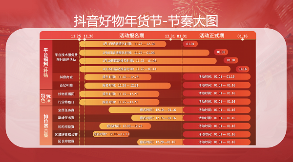 據(jù)抖音電商活動運營總監(jiān)謝湛介紹,抖音好物年貨節(jié)會從平臺玩法和活動玩法雙重發(fā)力,對優(yōu)質(zhì)商品及品牌加強(qiáng)扶持,助力合作伙伴實現(xiàn)品效爆發(fā)。平臺玩法包含年貨爆款榜單、年貨節(jié)百億補(bǔ)貼、直播裂變紅包等玩法,釋放平臺資源和福利促進(jìn)銷售轉(zhuǎn)化;顒油娣▽⑼瞥鲋匕跬娣、直播間玩法和排位賽玩法等不同玩法,滿足合作伙伴的個性化營銷需求。