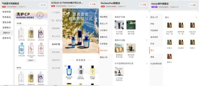 傳統(tǒng)個(gè)護(hù)品牌之于香氛,傳統(tǒng)香水品牌之于個(gè)護(hù),當(dāng)下都不再只是玩玩而已的跨界姿態(tài),縱觀一眾香水品牌的天貓旗艦店導(dǎo)航頁,可以看到家居香氛、洗護(hù)產(chǎn)品幾乎已經(jīng)成了新老香水品牌的標(biāo)配,從國際一線香水品牌祖瑪瓏、Diptyque、帕爾瑪之水,到新興的國產(chǎn)品牌冰希黎、普拉斯兔、氣味圖書館和RE調(diào)香室,其個(gè)護(hù)產(chǎn)品線的豐富和全面無一不在提醒著傳統(tǒng)個(gè)護(hù)品牌們:“小心,你們的市場(chǎng)我也盯上了。”