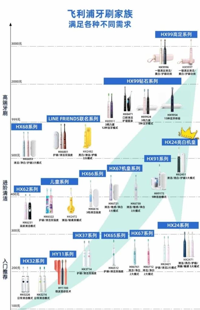 品牌當(dāng)然也不會(huì)貿(mào)然漲價(jià),往往會(huì)采取消費(fèi)者更易于接受的方式,比如推出更進(jìn)階的Pro款產(chǎn)品,或者通過劃分外出旅行和家用場(chǎng)景推出更高單價(jià)的產(chǎn)品,或者通過需要定期更換的配套附件提升復(fù)購和品牌粘性。以飛利浦為例,從100元到3000元,其牙刷家族按照入門推薦/進(jìn)階清潔/高端牙刷分為三個(gè)主要價(jià)格帶,橫向又根據(jù)具體的功能、人群、聯(lián)名款劃分,一共包含了大約25個(gè)SKU。