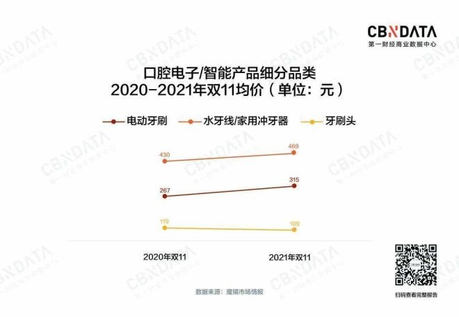 銷量的增長雖然放緩,但品牌并非沒有其他提升銷售額的辦法,漲價(jià)似乎是個(gè)不錯(cuò)的選擇。從價(jià)格來看,21年雙11電動(dòng)牙刷均價(jià)達(dá)到315元,同比增長18%。