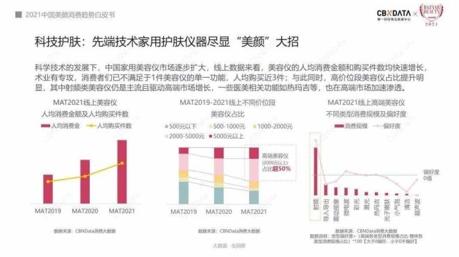 根據(jù)CBNData發(fā)布的《2021中國美顏消費(fèi)趨勢(shì)白皮書》,美容儀人均消費(fèi)金額和購買件數(shù)增長迅速,2000-5000元取代500元以下成美容儀主流定價(jià)區(qū)間。消費(fèi)金額提高很大程度源于消費(fèi)需求的變化,從商品上看射頻、激光技術(shù)的抗老類產(chǎn)品銷量最好,而這類美容儀由于技術(shù)和所用材料比一般清潔類美容儀先進(jìn),功效上更加進(jìn)階—主要針對(duì)輕熟齡/熟齡肌膚,因此定價(jià)偏高。