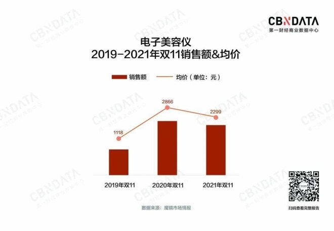 同時(shí)我們也需要看到,從19年的87.9%到21年95.9%,電子美容儀始終占據(jù)了面部美容工具的絕對(duì)份額,而其客單價(jià)也從19年雙11的1118上升至21年的2299,可以說兩年翻了一番。
