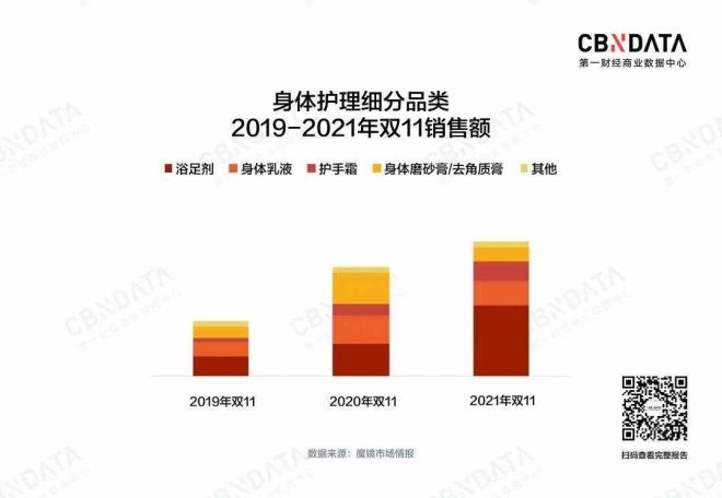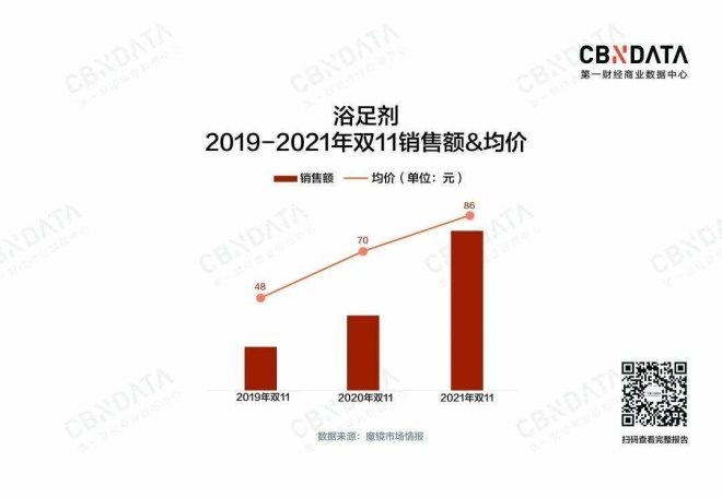 營銷層面的熱鬧反映在最終的銷售成果上,也是令人驚訝的,在身體護(hù)理這一細(xì)分類目下,浴足劑的雙11銷售額同比增長112.2%,銷售額占比從20年的30.38%躥升至21年的52.26%,成為身體護(hù)理里當(dāng)之無愧的第一品類,其整體銷售額增長背后一是銷量的提升驅(qū)動(dòng),另外一點(diǎn)則是均價(jià)的顯著提升,浴足劑的均價(jià)從19年雙11的48元提升至21年的86元,兩年的復(fù)合增速高達(dá)33.9%,中高價(jià)的產(chǎn)品被不斷推出并受到消費(fèi)者認(rèn)可。