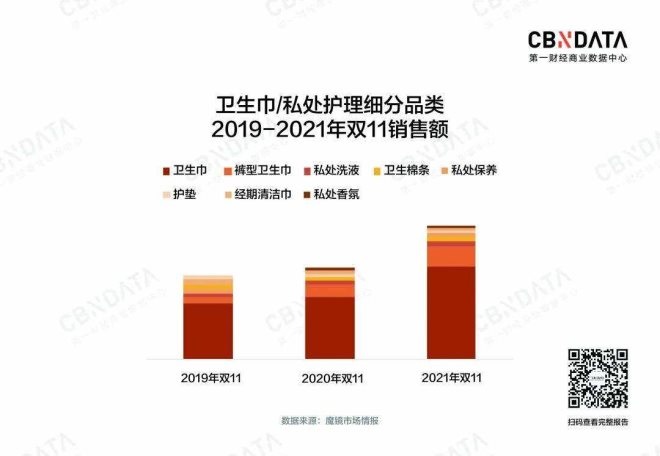 細(xì)致來看,身為洗護(hù)大類下第一品類的衛(wèi)生巾/私處護(hù)理,其增長主要受到褲型衛(wèi)生巾這一品類的驅(qū)動(dòng),褲型衛(wèi)生巾的雙11銷售額同比增幅高達(dá)71.2%,其銷售額占比從19年雙11的7.75%提升至21年的15.87%,而衛(wèi)生巾的銷售額占比則從19年的83.1%下降至21年的74.5%,雖然二者整體增速都還不錯(cuò),但顯然褲型衛(wèi)生巾這一細(xì)分品類相對(duì)于傳統(tǒng)衛(wèi)生巾,其替代效應(yīng)不可謂不明顯。而作為20年才出現(xiàn)的新品類,經(jīng)期清潔巾的銷售額同比增幅高達(dá)769.2%,即便其占比較小,也可以看出消費(fèi)者對(duì)于這種特定場(chǎng)景專用產(chǎn)品的需求勢(shì)頭正猛。