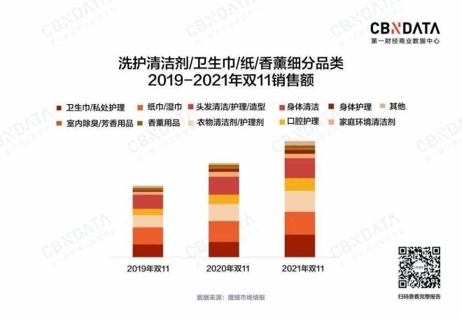 回顧2021年雙11數(shù)據(jù),CBNData發(fā)現(xiàn)洗護(hù)清潔劑/衛(wèi)生巾/紙/香薰大類下,前五大品類銷售額占比接近80%,其中分列第1名和第4名的衛(wèi)生巾/私處護(hù)理和口腔護(hù)理同比增速分別高達(dá)47.1%和41.2%(整體大類同比增速為25.6%)。