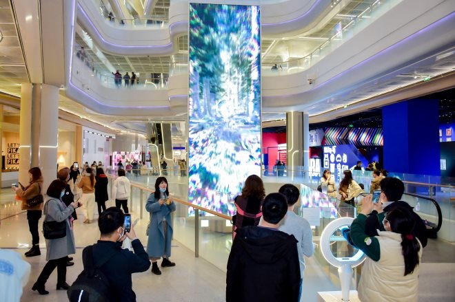 開業(yè)現(xiàn)場多個(gè)藝術(shù)場景成為公眾打卡拍照圣地,包括CATLAB央美西岸實(shí)驗(yàn)室為項(xiàng)目量身定制的原創(chuàng)多媒體互動(dòng)作品《幻林》、模擬自然之美的地下一層空間、穿梭時(shí)空的光之眼、科技殿堂般的一層空間等均成為鏡頭焦點(diǎn)。