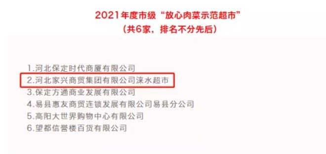 保定市6家超市獲評(píng)市級(jí)2021年度“放心肉菜示范超市”,其中河北家興商貿(mào)集團(tuán)有限公司淶水超市入選!