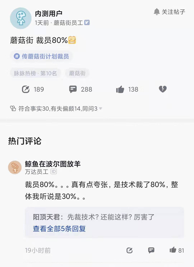 近日,脈脈上一則“蘑菇街裁員”消息被廣泛關(guān)注,多位網(wǎng)友稱:知名電商平臺(tái)蘑菇街正在裁員,其中傳出裁員80%是技術(shù)部門,整體裁員在30%左右。此次調(diào)整后,技術(shù)部門只留下三十余人,運(yùn)維部門僅剩3人,產(chǎn)品崗則僅剩2人。