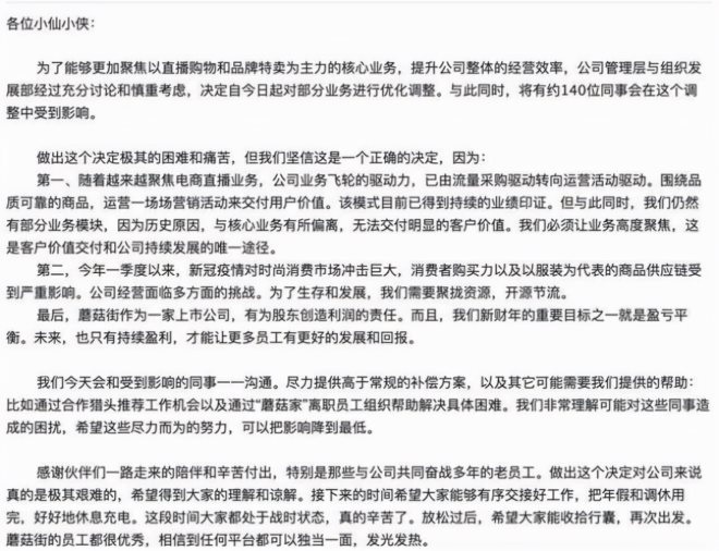 2020年2月28日,蘑菇街公告宣布:高級(jí)副總裁曾憲杰因個(gè)人原因離職。一個(gè)月后,蘑菇街CFO吳婷也正式辭職。同日,直播負(fù)責(zé)人金婷婷(花名洛伊)也離開(kāi)了蘑菇街,隨后便發(fā)布了上文提到的裁員內(nèi)部信,將人事變動(dòng)都?xì)w結(jié)于業(yè)務(wù)結(jié)構(gòu)的正常調(diào)整。
