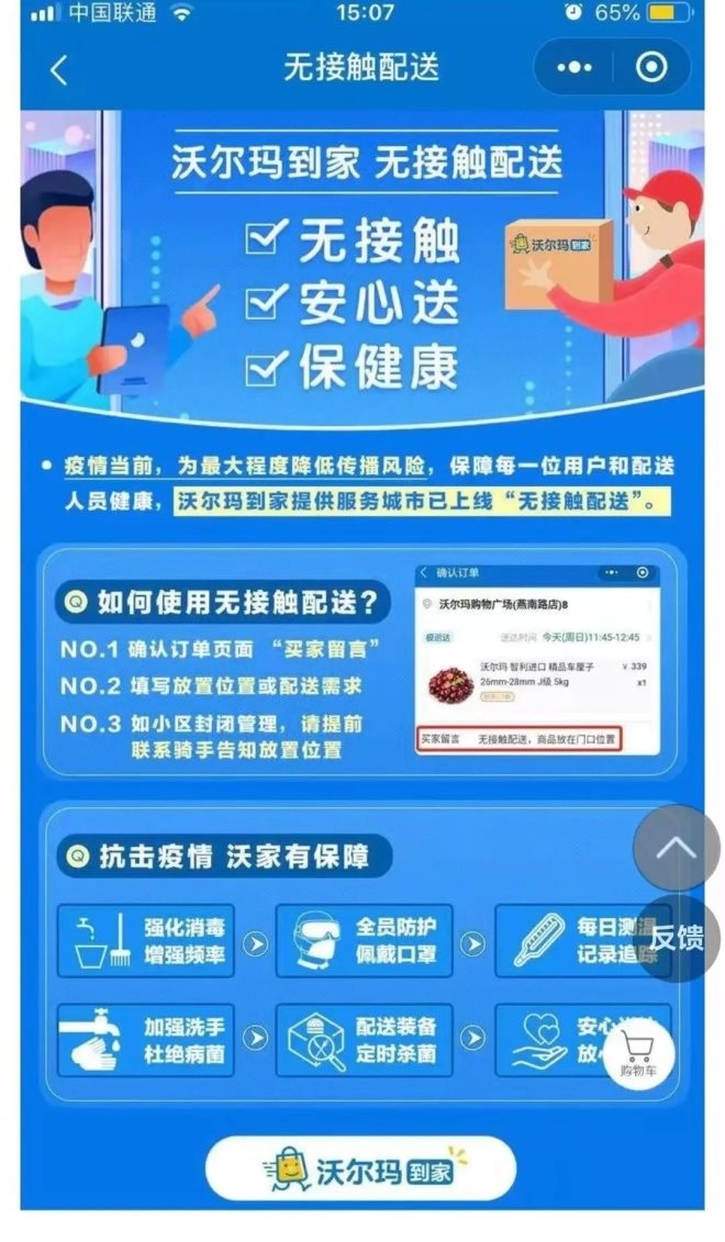 沃爾瑪鼓勵消費(fèi)者選擇沃爾瑪?shù)郊一蛏缛合聠螘r,選擇 “無接觸配送”服務(wù),減少配送人員和顧客及的感染風(fēng)險。同時加強(qiáng)社群顧客溝通,及時將門店和線上的服務(wù)情況、安全防護(hù)無接觸配送、防疫用品等信息分享給顧客和會員。