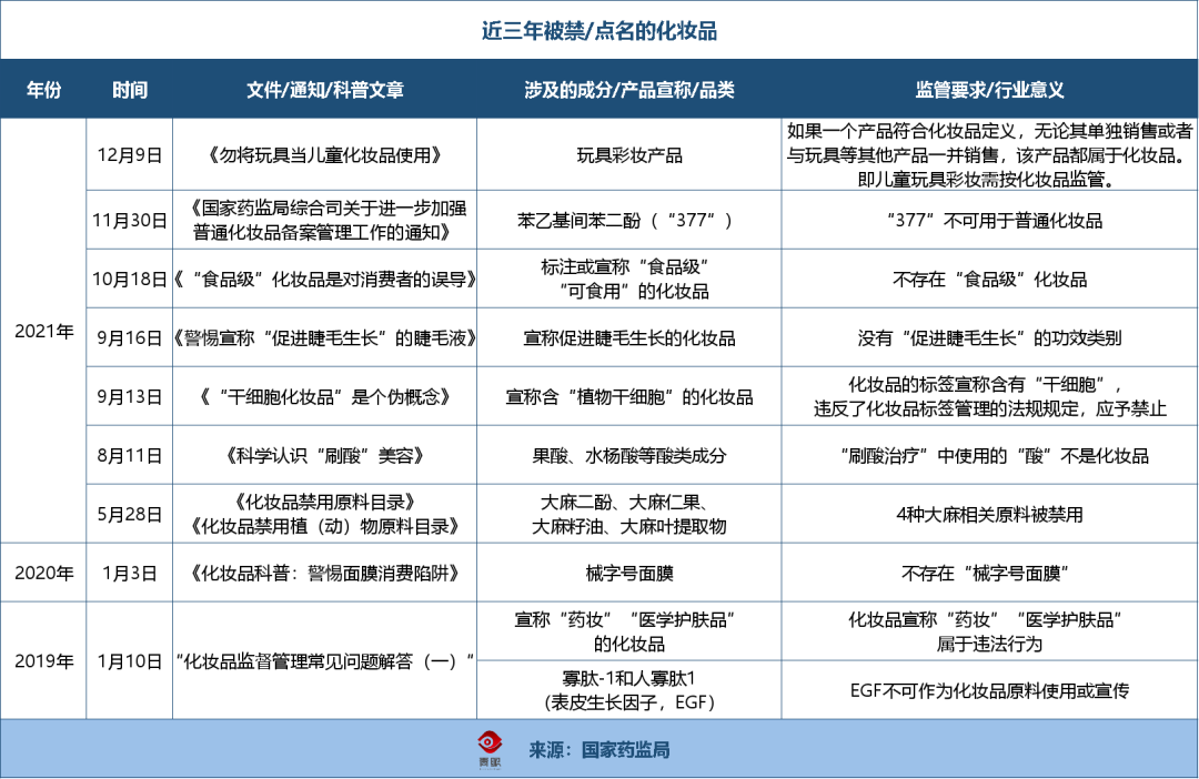 加上2019年1月被禁的“藥妝”“醫(yī)學(xué)護(hù)膚品”宣稱和“EGF化妝品”,以及2020年1月,一紙公文徹底給所謂的“械字號(hào)面膜”判下“死刑”,近三年來(lái),共有10類產(chǎn)品“涼涼”。