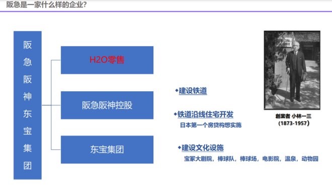 我們在PPT上可以看到我們這邊的創(chuàng)業(yè)者叫做小林一三先生。他是日本一個著名的企業(yè)家,他開始是設想是說要進入鐵道,因為當時在日本的話沒有自己的家,大家都住在大阪的城市里,都是借家來住,那他當時開發(fā)的這個想法就是說他把電車拉到郊外去開店,先做一個鐵道,在鐵道周圍建立了許多住宅區(qū)。那么當時的人住在大阪的時候沒有自己的家,他在開發(fā)了這些住宅的時候,就把大阪的這些居民引到了郊外的住宅區(qū),而且他也是日本第一個構(gòu)想房貸的一個人,實現(xiàn)了日本第一個房貸和實施。他這一筆整個大阪中心的關(guān)西地區(qū)的經(jīng)濟帶起來。那才他在在他在整理這個電車還有商業(yè)住宅的同時,他把這個終點站建立了一個百貨店。