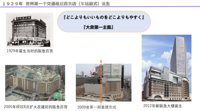 我要給大家介紹一下阪急百貨是什么樣的一個企業(yè)呢。實際上阪急百貨它是世界上第一個交通樞紐的百貨店,也就是說電車的終點站的一個百貨店,它是1929年誕生的。那在我們PPT上可以看到左上角這個圖是1929年誕生時候的阪急百貨,它看起來是一個小小的四方形正方形的一個百貨店。那我們再看一下它誕生的時候小林一三先生就有兩個理念。