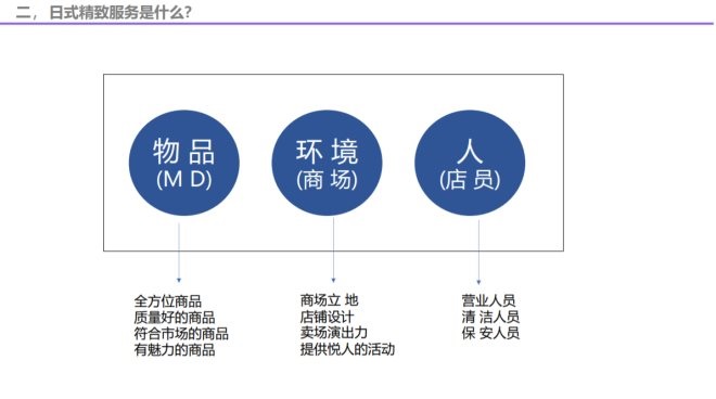 在這張圖上我們可以看到一提到百貨店或者是百貨商場,做百貨有三個最主要的點,也就是物品,環(huán)境,人。商品來講就是MD,環(huán)境就是說商場,人就是店員。
