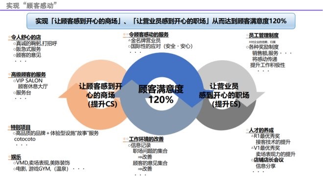 對于我們寧波阪急來說,怎樣才能使顧客120%滿意度?實現(xiàn)讓顧客感到開心的商場,在此同時也要讓我們員工我們營業(yè)員感到我們這個賣場這個職場是非常開心的。這兩者相乘才能夠達到顧客滿意度120%。在CS當中我們下了很大的功夫,我們寧波阪急做的根日本阪急比的話,連10%都沒有做到。但我們現(xiàn)在開始抓人的教育,抓我們的CS。