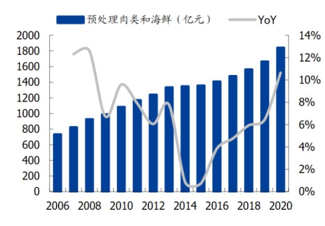 圖:預(yù)處理肉類和海鮮市場規(guī)模及增速(來源:中國產(chǎn)業(yè)信息網(wǎng)、國盛證券研究所)