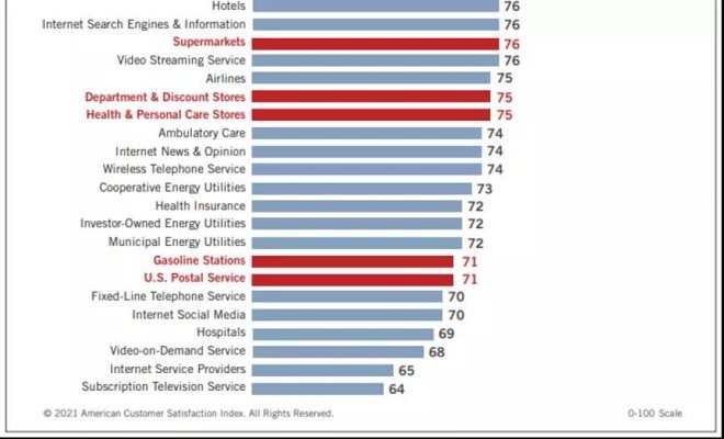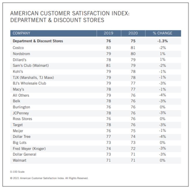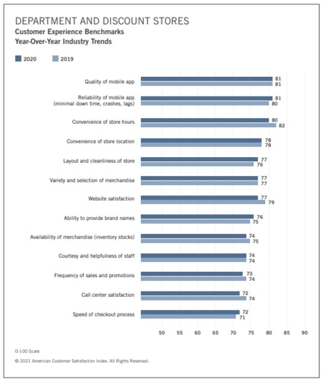 盡管大多數(shù)零售企業(yè)預(yù)計2021年經(jīng)營環(huán)境將發(fā)生改善,但顧客滿意度并沒有朝著期望的方向發(fā)展。根據(jù)美國顧客滿意度指數(shù)(ACSI?),零售行業(yè)整體下滑2.3%為75.5分(總分100)。這是自2015年以來該行業(yè)的最低得分。