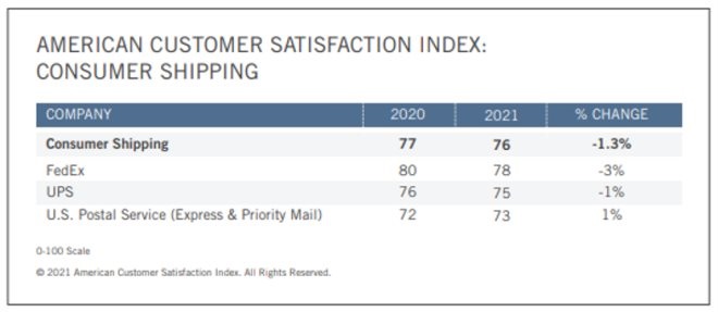 在三大快遞巨頭中,聯(lián)邦快遞(FedEx)得分盡管下滑了3%為78分,但仍保持領(lǐng)先地位。UPS的顧客滿意度連續(xù)三年下降,2020年下降1%至75分。2020年這兩家公司都創(chuàng)下歷史新低。美國郵政服務(wù)(USPS)的特快專遞服務(wù)獲得了73分,縮小了與私營快遞公司的差距。