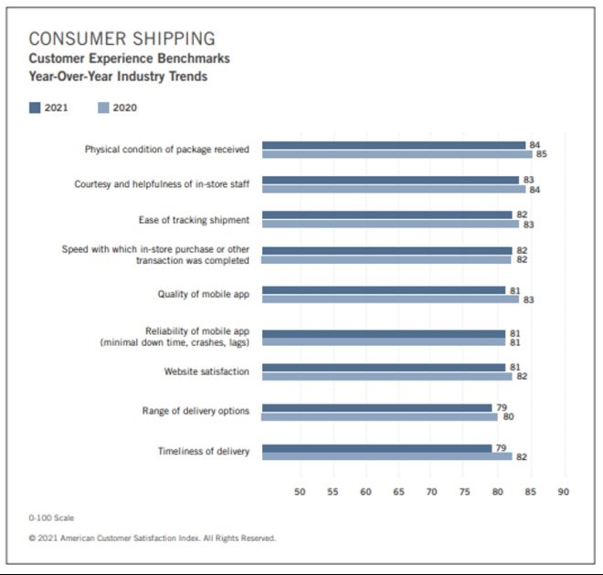 該行業(yè)其他方面的得分很高,都處在80分這一檔。顧客對收到包裹的外觀等狀況感到滿意(84分)。門店員工彬彬有禮、樂于助人(83分),包裹容易跟蹤(82分)。門店寄送速度(82分)遠(yuǎn)高于實體零售店的結(jié)賬速度(從72到79分不等)。