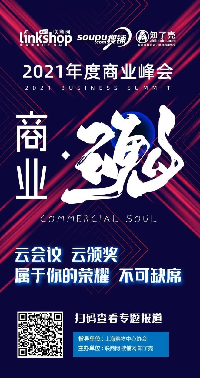 以“商業(yè)·魂”為主題的2021年度商業(yè)峰會于12月28日在上!きh(huán)球港凱悅酒店舉行。本次大會由上海購物中心協(xié)會指導(dǎo),聯(lián)商網(wǎng)、搜鋪網(wǎng)、知了殼主辦,秉承高度的社會責(zé)任感,積極配合政府疫情防控需求,大會以線上直播云會議模式,仍然受到行業(yè)密集關(guān)注。