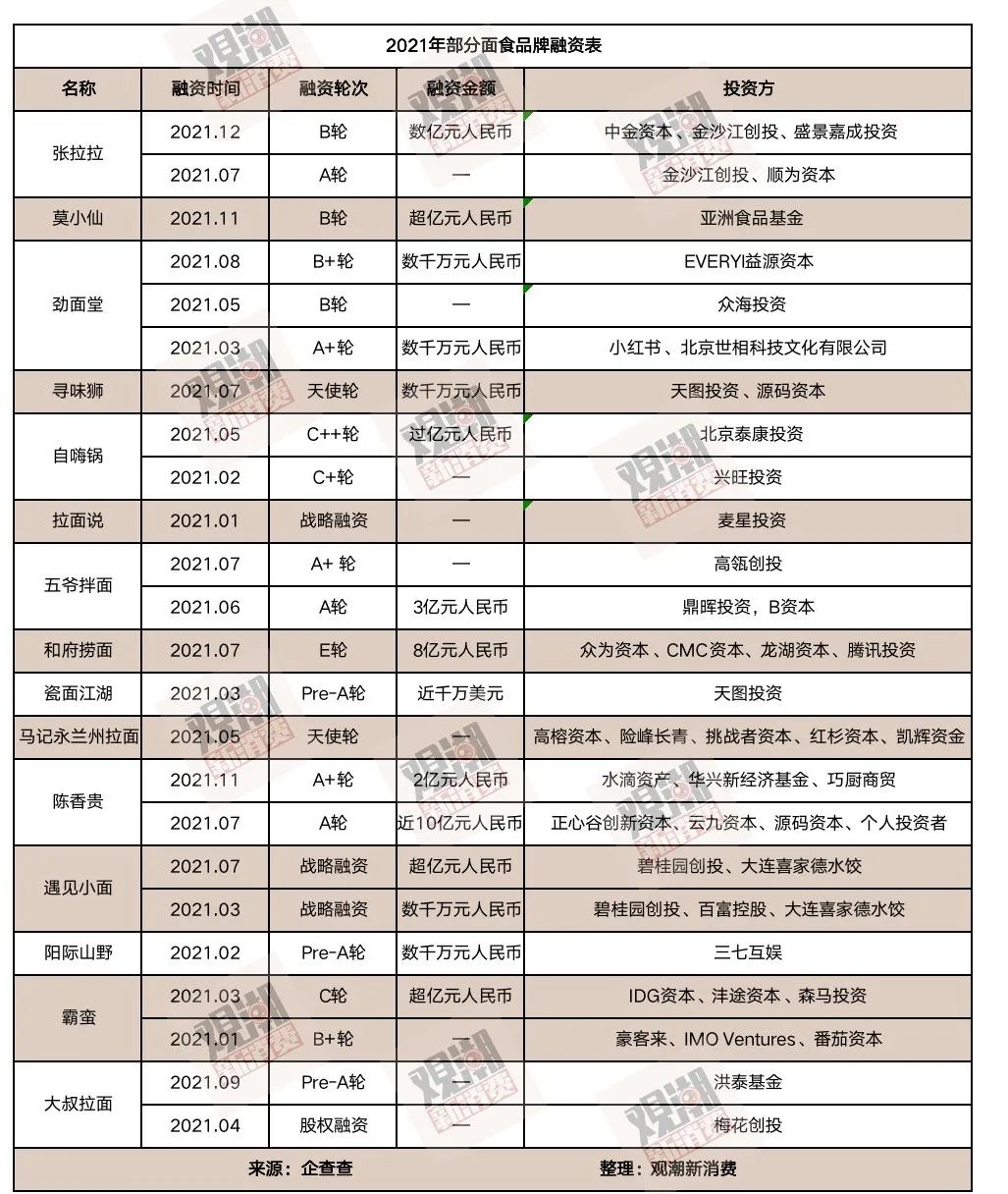 2021年牛肉面最香。從5月到12月,僅陳香貴、馬記永、張拉拉三個(gè)牛肉面品牌就融了五輪,每輪融資金額均在億元以上,陳香貴A輪融資就近10億元。12月,張拉拉剛完成了數(shù)億元B輪融資,這是其今年來第二輪融資,其中金沙江創(chuàng)投連續(xù)投資。