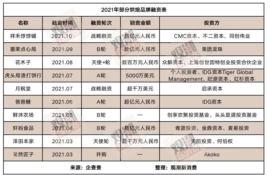 據(jù)觀潮新消費(fèi)不完全統(tǒng)計(jì),2021年烘焙品牌融資事件10起,其中墨茉點(diǎn)心局就完成了3輪融資,虎頭局也先后獲得紅杉資本中國(guó)、IDG資本、GGV紀(jì)源資本等2輪融資,烘焙賽道融出了億級(jí)市場(chǎng)。