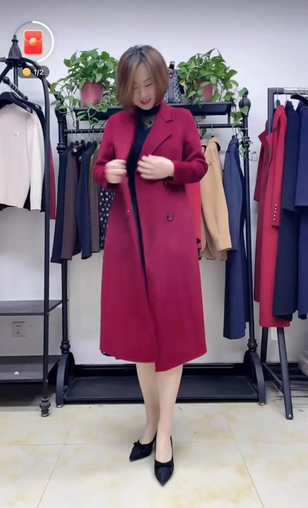 小冰在直播間展示羊絨大衣