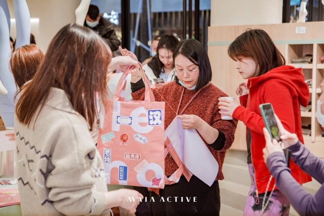 開業(yè)當(dāng)天,基于“把城市變成游樂場”的品牌社群核心理念,品牌開啟華中地區(qū)「MAIA FUN CLUB」首場消費者線下活動——“MAIA城市熱練樂園”。武漢消費者通過線上報名,不僅可以參與“DIY自己的快樂”,在手作老師的帶領(lǐng)下,利用提前清洗好的店鋪圍檔材料,制作專屬環(huán)保手袋;還可以參與“MAIA熱練營”——大球瑜伽,體驗瑜伽的完全伸展到多人大球瑜伽互動。