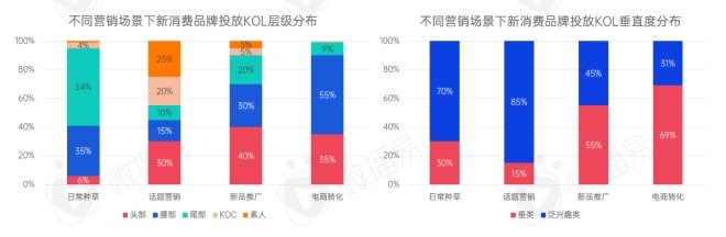 從新消費(fèi)品牌的KOL投放分布中,可以發(fā)現(xiàn),在日常種草的營銷場景中,KOL投放聚焦在尾部達(dá)人和泛興趣類達(dá)人中;在話題營銷的訴求下,KOL投放側(cè)重于頭部達(dá)人和泛興趣類達(dá)人;在新品推廣的營銷場景中,KOL投放側(cè)重于頭部達(dá)人和垂類達(dá)人;而在電商轉(zhuǎn)化的訴求下,KOL投放則側(cè)重于腰部達(dá)人和垂類達(dá)人?偠灾,不同的營銷場景,新消費(fèi)品牌會(huì)選擇不同的KOL策略進(jìn)行推進(jìn),以獲得最佳營銷效果。