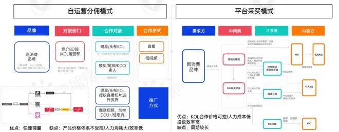 在主流市場中,新消費(fèi)品牌主要通過自運(yùn)營分傭和平臺(tái)采買與KOL進(jìn)行合作。通常情況下,成長初期的新消費(fèi)品牌通常會(huì)采用自運(yùn)營分傭的方式,即通過公司內(nèi)部媒介BD化模式實(shí)現(xiàn)快速KOL投放與市場鋪量,但這種KOL采購模式需要大量的內(nèi)部人員支撐,同時(shí)效率較低;而成長后期的新消費(fèi)品牌通常會(huì)通過平臺(tái)級采買模式進(jìn)行大批量投放,投放效率更高、KOL合作價(jià)格也更加可控。