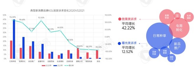 而從2021年新消費(fèi)品牌的KOL營銷訴求來看,日常種草仍為主要訴求,占45%;其次是電商轉(zhuǎn)化、新品推廣、直播帶貨,分別占25%、20%、17%。整體上,效果類訴求平均增勢明顯,直播帶貨增速為112.5%、電商轉(zhuǎn)化增速為98%,整體效果類訴求平均增長為42.22%?梢,新消費(fèi)品牌愈發(fā)看重KOL以及KOL營銷的貨架作用和效果,營銷訴求也逐漸向轉(zhuǎn)化類傾斜。