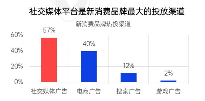 根據(jù)尼爾森數(shù)據(jù)顯示,相比于只有42%的人信任線上硬廣的推薦內(nèi)容,有高達(dá)84%的人信任社交媒體的推薦信息。而根據(jù)Morketing數(shù)據(jù)顯示,社交媒體廣告已經(jīng)成為新消費(fèi)品牌最大的投放渠道,其次是電商廣告、搜索廣告及游戲廣告?梢砸姷茫缃幻襟w、KOL傳播已經(jīng)成為品牌營銷的一大核心陣地。