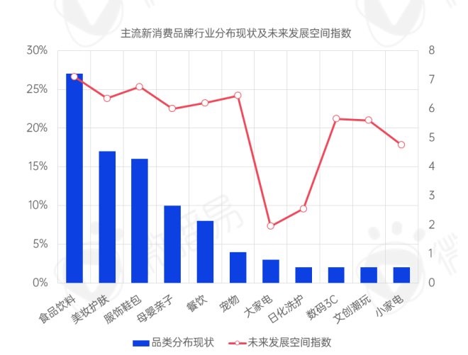 從目前產(chǎn)品品類的行業(yè)分布特征來看,市場集中度低、產(chǎn)品迭代速度快、品牌效應(yīng)低以及消費(fèi)者妥協(xié)度低的行業(yè)更容易成為新消費(fèi)品牌快速崛起的賽道。通過《報(bào)告》可以發(fā)現(xiàn),食品飲料、美妝護(hù)膚、服飾鞋包、母嬰親子、寵物成為了主流的新消費(fèi)品牌聚集行業(yè);若從未來發(fā)展空間來看,大家電、日化洗護(hù)兩大行業(yè)由于傳統(tǒng)品牌壁壘較高,新消費(fèi)品牌逆襲成熟品牌的可能性相對較低。